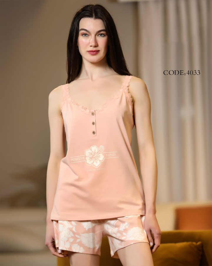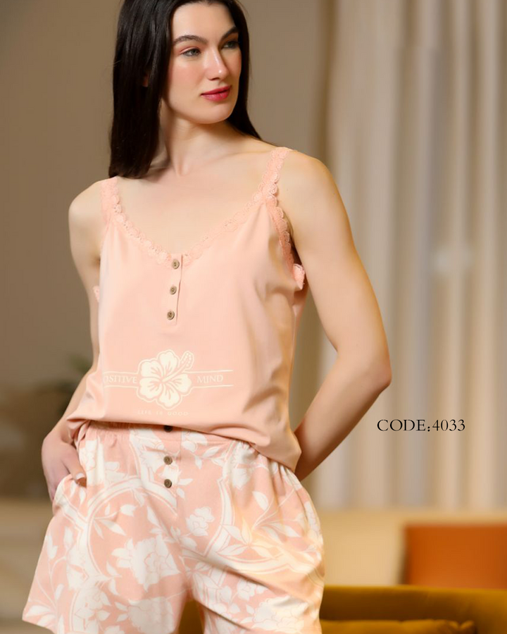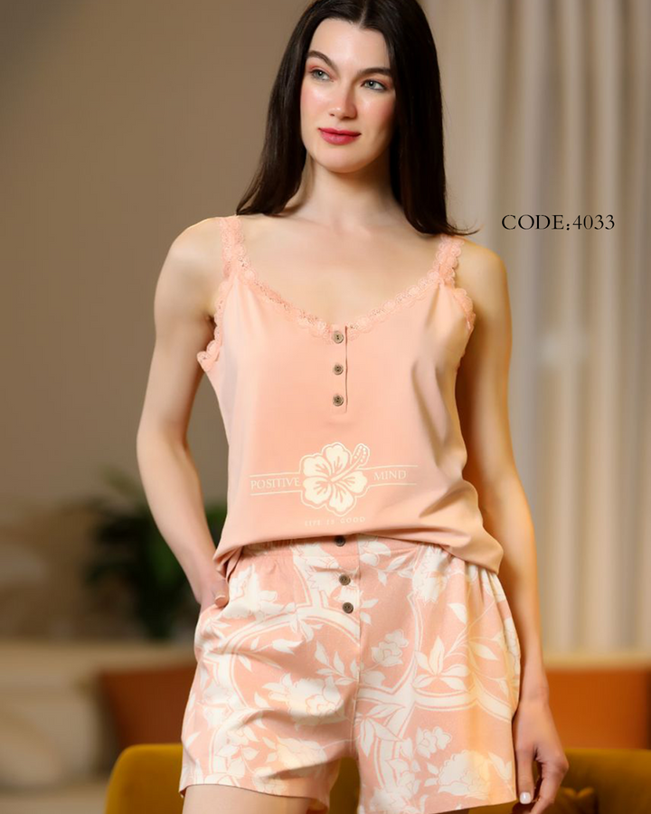 استمتعي بليالٍ هادئة وأيامٍ مريحة مع بيجامة الأحلام المصنوعة من القطن الناعم 100%. تيشيرت بتصميم تيشرت كت يمنحك حرية الحركة وشعورًا بالانتعاش، بينما يكمل شورت بقصته المريحة الإطلالة، ليمنحك شعورًا بالاسترخاء المطلق. مثالية لأوقات الاسترخاء في المنزل أو النوم العميق