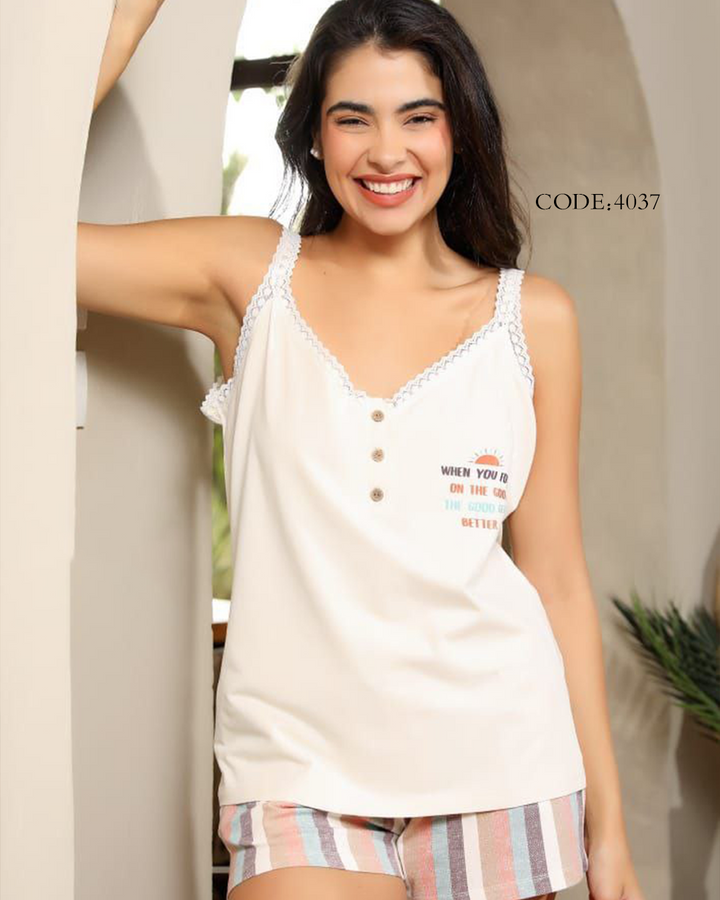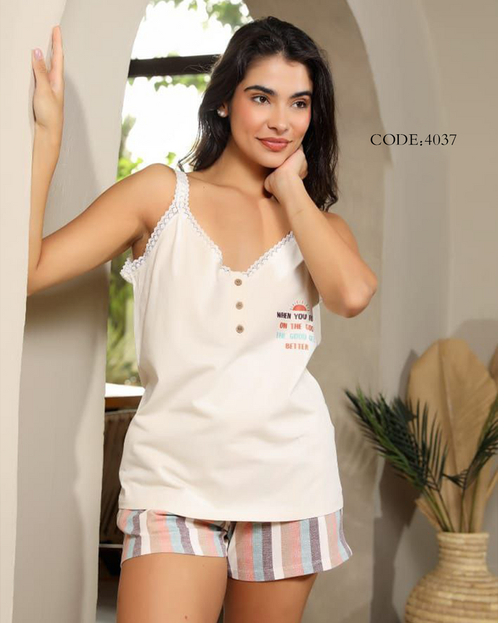 استمتعي بليالٍ هادئة وأيامٍ مريحة مع بيجامة الأحلام المصنوعة من القطن الناعم 100%. تيشيرت بتصميم تيشرت كت يمنحك حرية الحركة وشعورًا بالانتعاش، بينما يكمل شورت بقصته المريحة الإطلالة، ليمنحك شعورًا بالاسترخاء المطلق. مثالية لأوقات الاسترخاء في المنزل أو النوم العميق