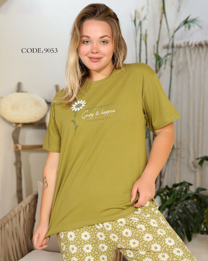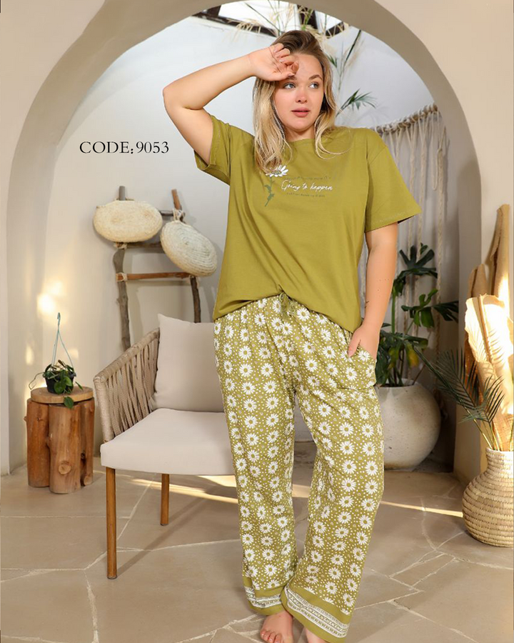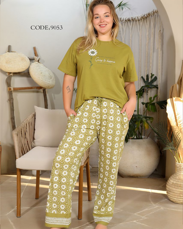 استمتعي بليالٍ هادئة وأيامٍ مريحة مع بيجامة الأحلام المصنوعة من القطن الناعم 100%. تيشيرت بتصميم تيشرت نص كم يمنحك حرية الحركة وشعورًا بالانتعاش، بينما يكمل بنطلون بقصته المريحة الإطلالة، ليمنحك شعورًا بالاسترخاء المطلق. مثالية لأوقات الاسترخاء في المنزل أو النوم العميق